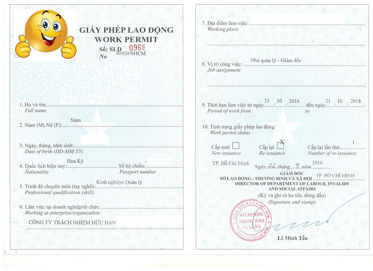 Giấy phép lao động hợp lệ phải được cấp bởi cơ quan quản lý nhà nước về lao động tại Việt Nam.