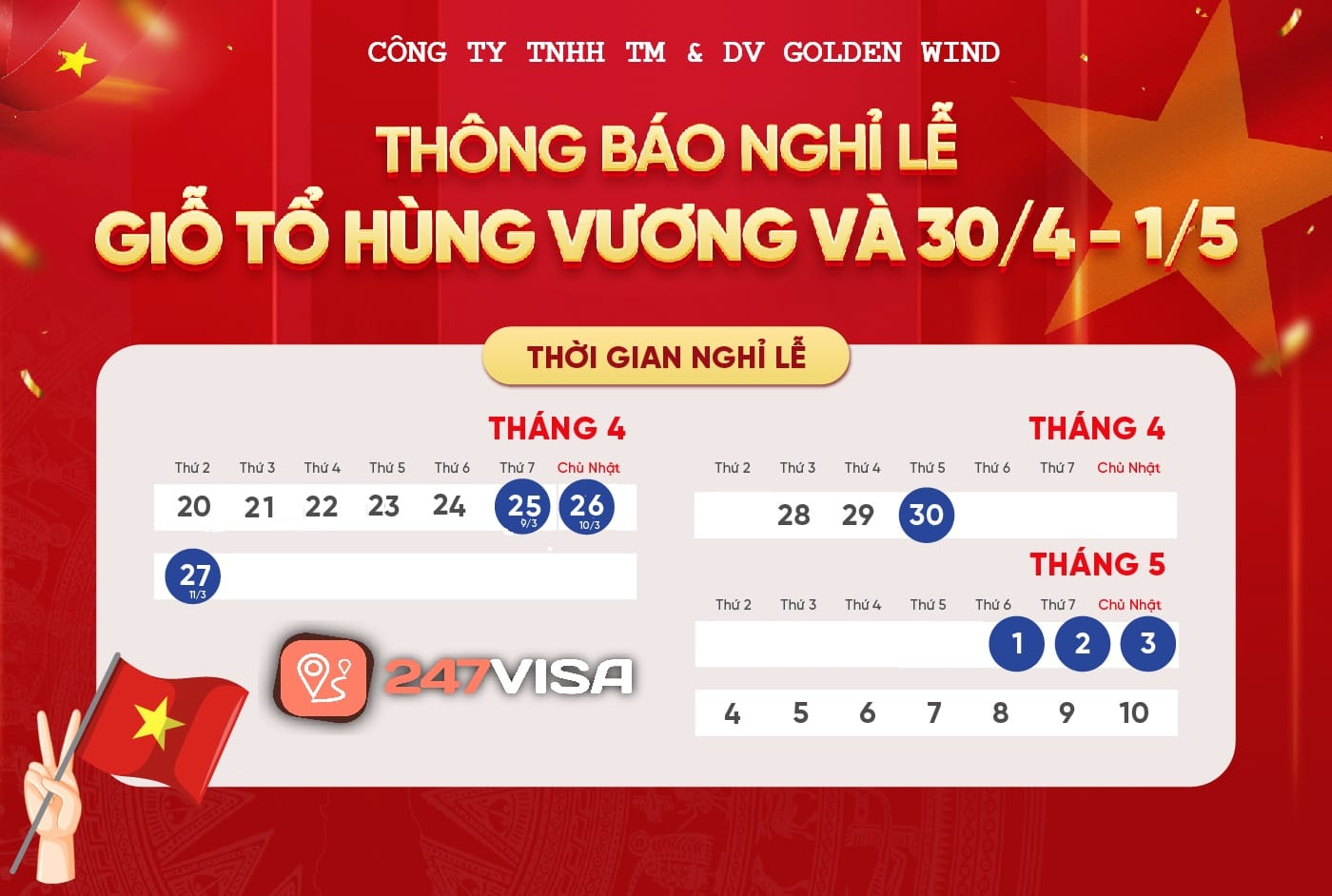 CÔNG TY TNHH TM & DV GOLDEN WIND trân trọng thông báo lịch nghỉ Giỗ Tổ Hùng Vương, Giải phóng miền Nam và Quốc tế Lao động năm 2026